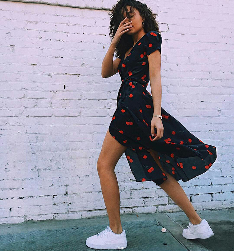 European and American holiday beach skirt cherry print short-sleeve v-neck lace-up long skirt wrap dress woman