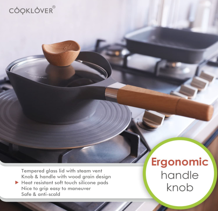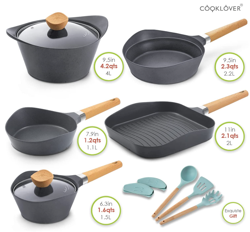 • ? ERGONOMIC BAKELITE KNOB AND HANDLE : COOKLOVER's cookware sets builds with heat resistant soft touch silicone Bakelite knob and handle with beautiful wood grain design (NOT REAL WOOD).