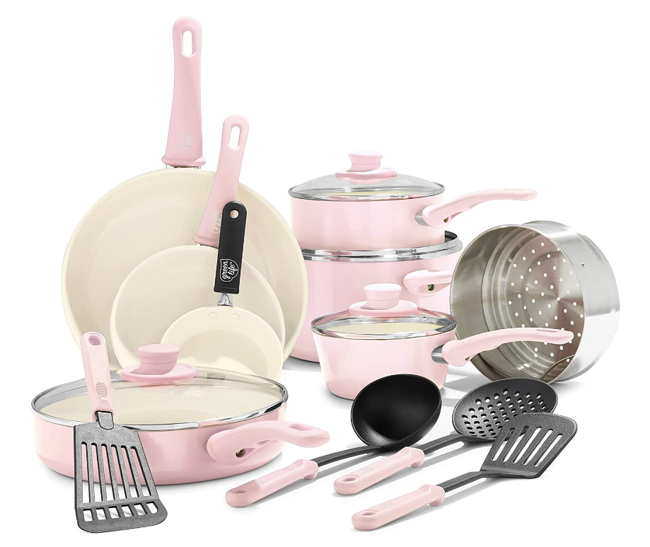 GreenLife Soft Grip Healthy Ceramic Nonstick, Cookware Pots and Pans Set, 16 Piece, Pink & CC003859-001 Cutting Board Set, Medium/Large, Pink