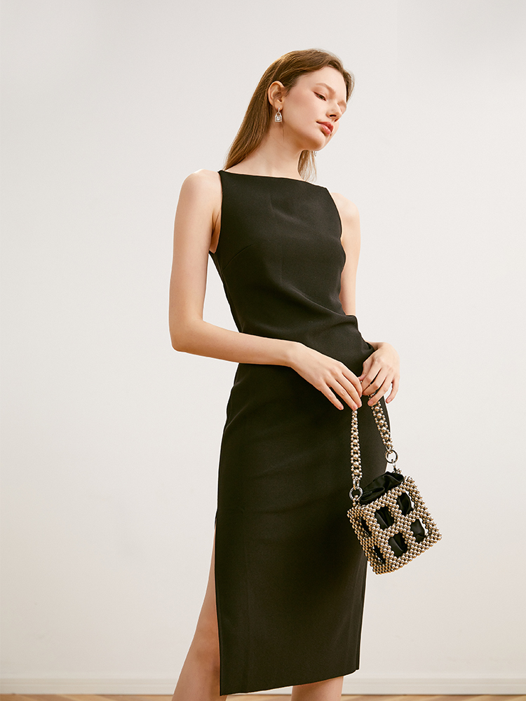 Oz country French one-neck acetate dress women's summer season change with pleated sexy slit little black dress