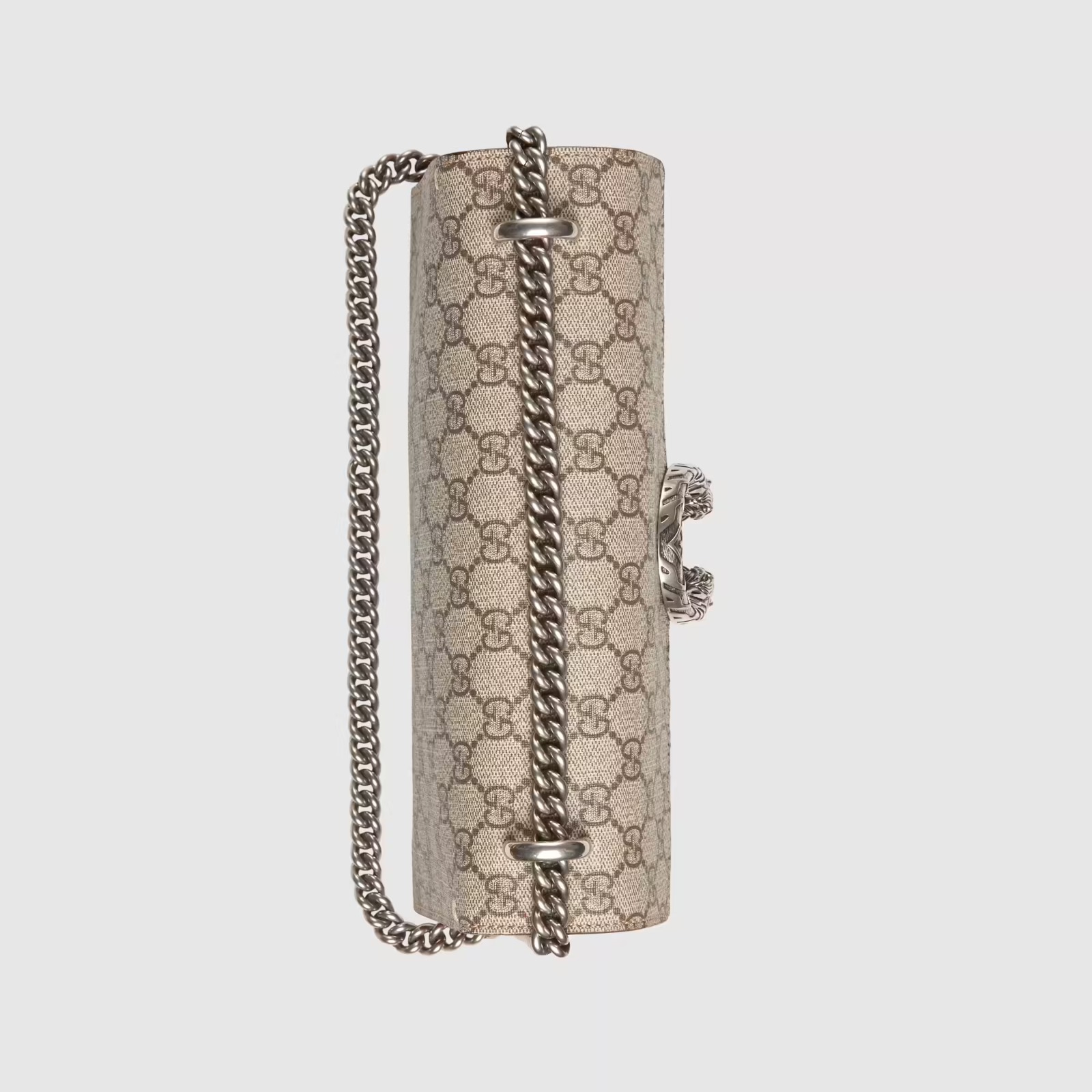 This upright GG Supreme canvas bag is decorated with unique textured tiger head buckle details, inspired by the Greek god Dionysus, who in Greek mythology rode a tiger sent by Zeus across the river Tigris.