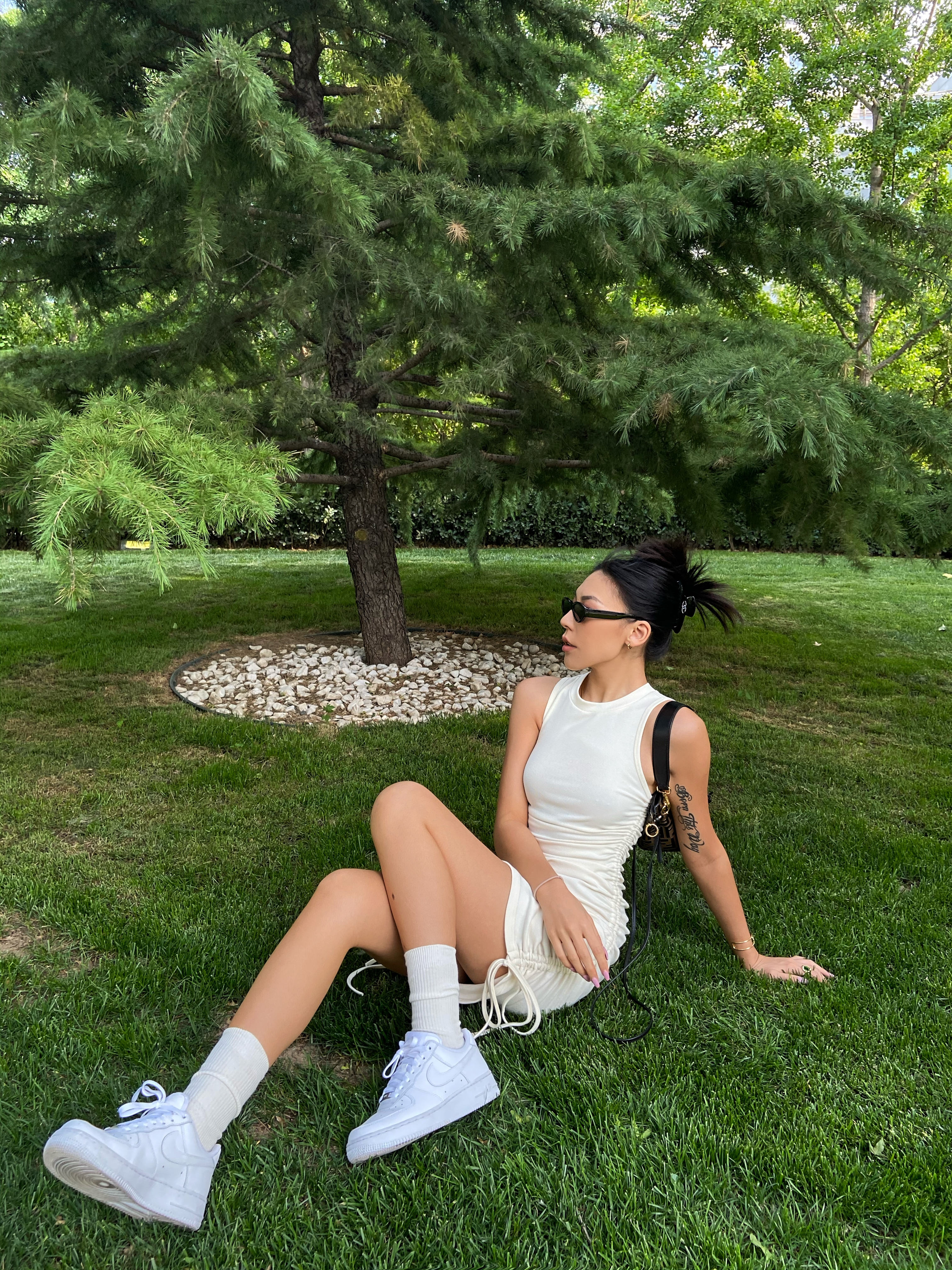 European white knit sleeveless rope drawstring dress women's summer slim waistcoat skirt