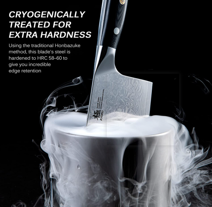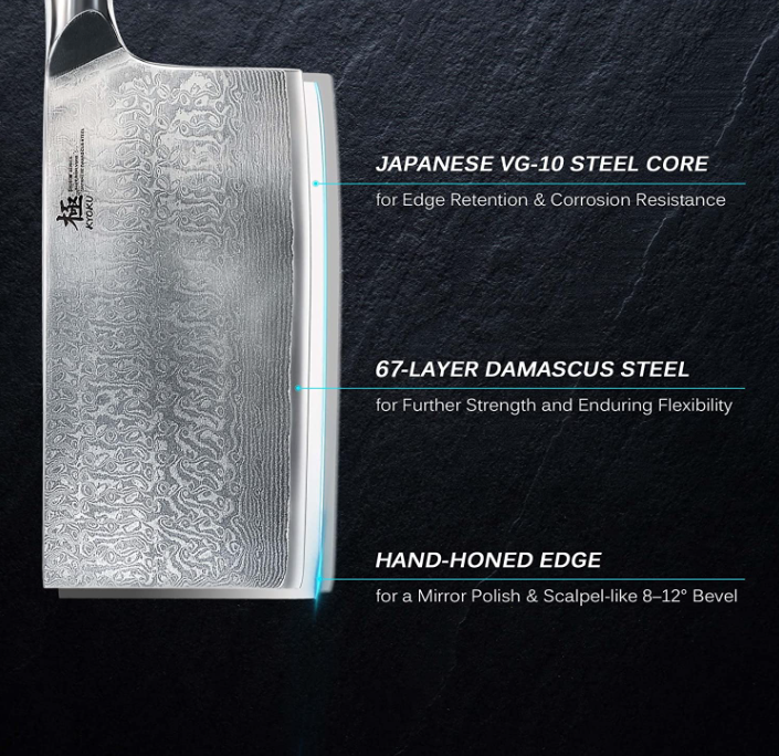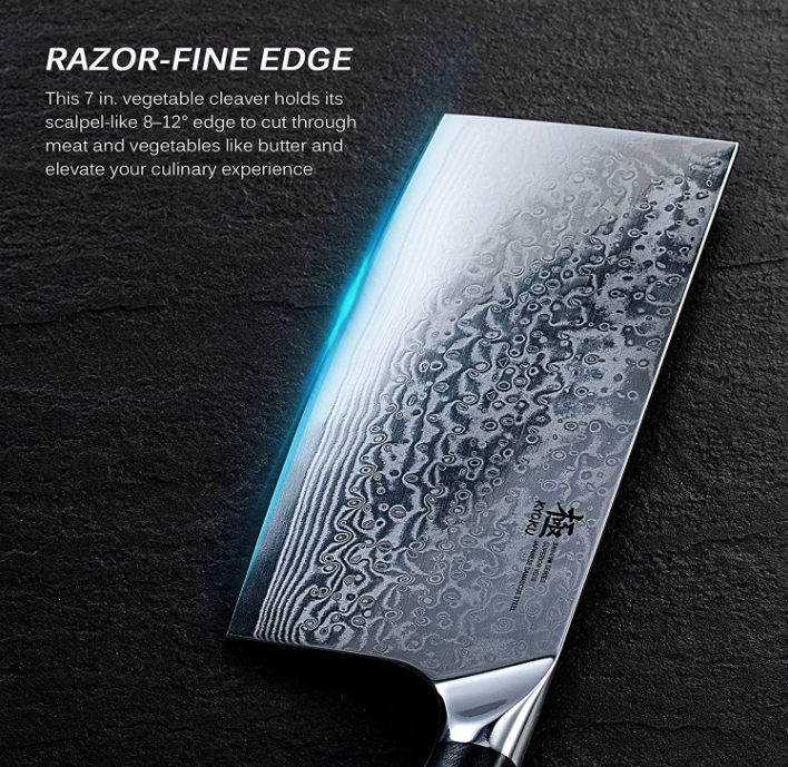• VG10 JAPANESE DAMASCUS STEEL - Manufactured with an ultra-sharp, cobalt-added, and cryogenically treated VG-10 Japanese Damascus steel cutting core at HRC 58-60 hardness, this 7 in. vegetable cleaver boasts unrivaled performance and incredible edge retention.