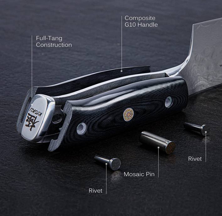 • DURABLE HANDLE - The meticulously constructed, triple-riveted G10 handle has gone through special treatment, making it extremely impervious to heat, cold, and moisture; accented with a mosaic pin.