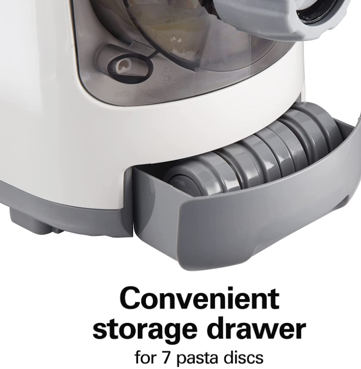 • Includes discs for 7 noodle shapes. Choose from Thick spaghetti, lasagna, spaghetti, Angel hair, wide noodle, penne and fettuccini. Storage drawer for discs inside pasta machine.