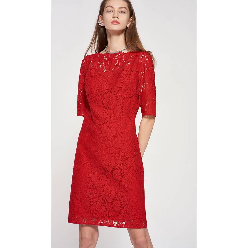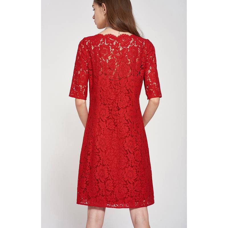 New European and American one - collar red wedding dress lace skirt sleeve dress daily wear dress