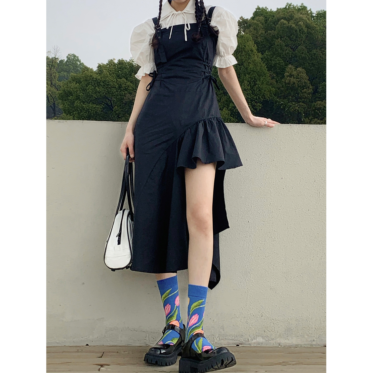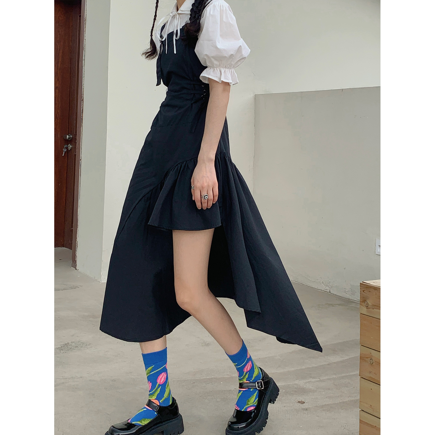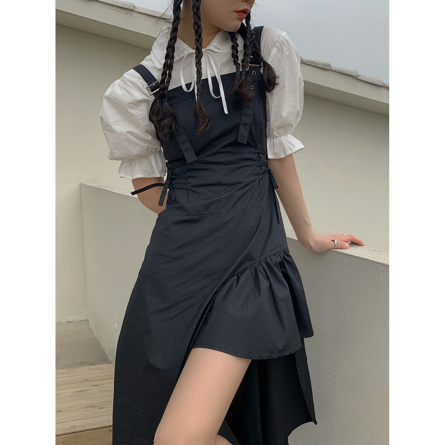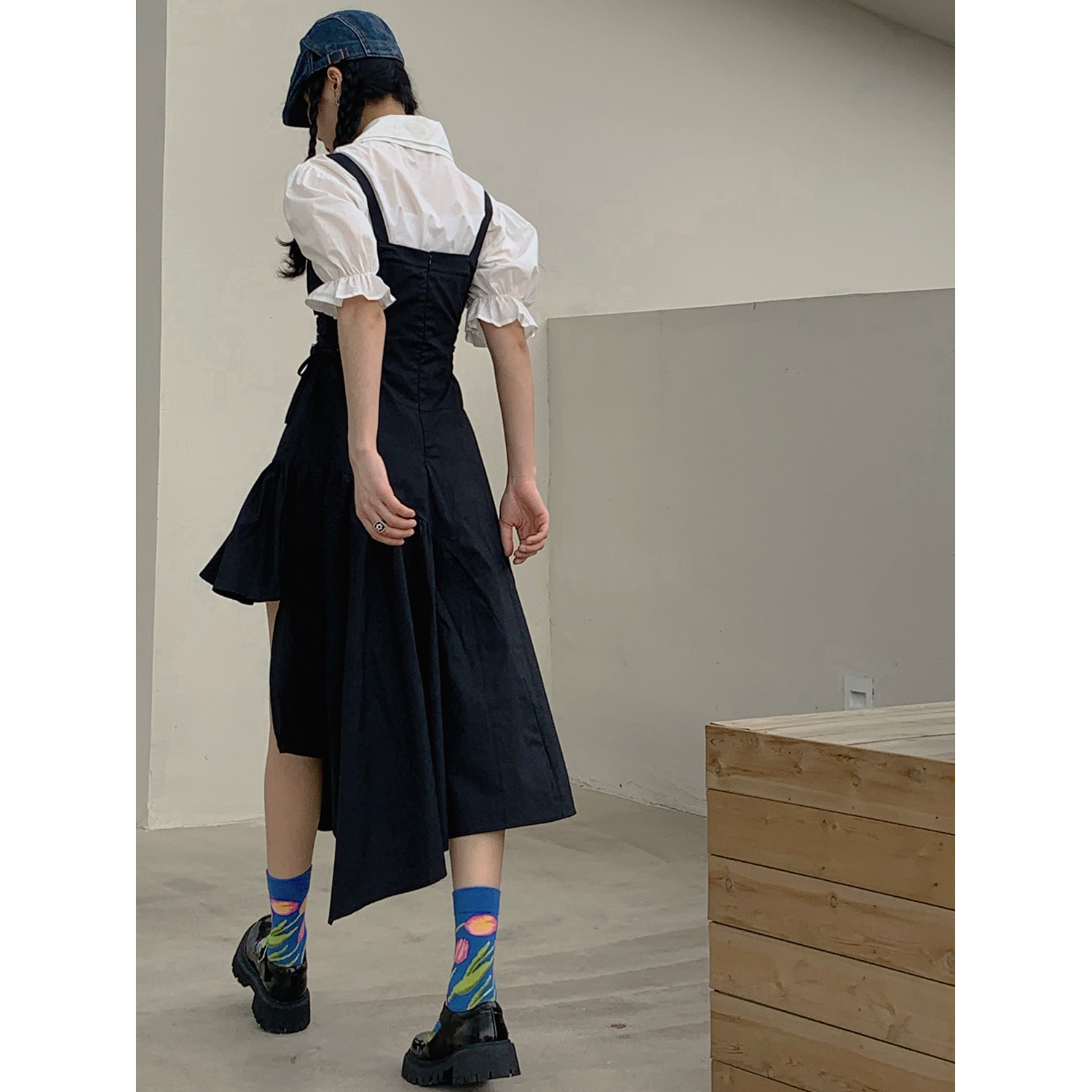 Size: S M L Fabric: Brocade pattern: plain color style: Commuter commuter: Korean collar type: One-word collar waist type: high waist garment Front: pullover color classification: black Sleeve type: Other combination form: single piece Item No. : YS-QZ-6205 Skirt Type: A-line skirt year season: 2022 Spring Sleeve length: Sleeveless skirt length: Fashion elements/craft: Flounces style: Suspenders Profile: A