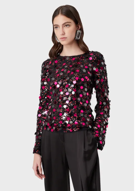 This standout item lends a dramatic edge to any outfit, without sacrificing Emporio Armani’s hallmark sophistication. The dense, different-sized sequin embroidery creates an all-over sparkling look that brightens eveningwear. Whimsical sensuality that breaks up total black with bright red or pink, creating outfits that sparkle at night. Women’s jumper with flared sleeves.