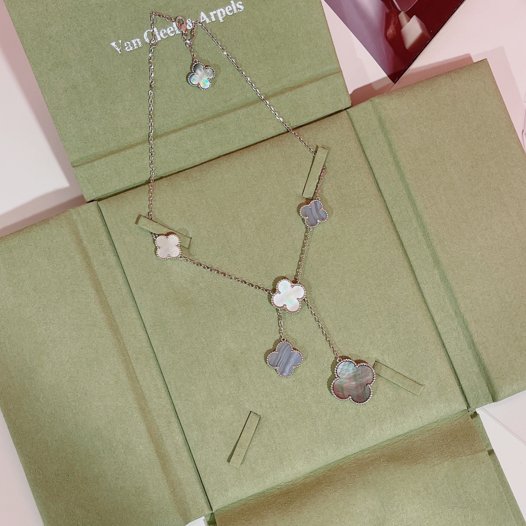Magic alhsmbra four-leaf clover necklace, this magic alhambra six-flower irregular necklace is a bit high-profile. Because it's so unusual, pay attention to the big color of clothing when matching. You can almost wear black or simple clothes, and the neckline must be large. It is made of V gold and inlaid with natural flawless purple chalcedony and grey fritillary bulb.