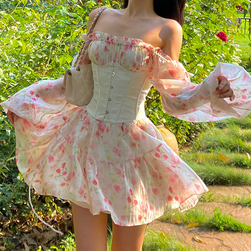 XIAOLI Fog powder Tulip 2022 New One-word shoulder Long bubble sleeves square collar floral Chiffon Dress women's summer