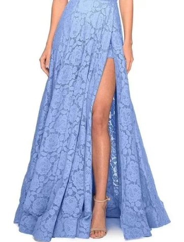 Perfectly crafted in splendid allover lace organza fabric, this stunning ensemble fashions a sleeveless fitted bodice with square neckline and empire fitted waistline. The back is as striking with a scoop shaped cut with the zipper closure at the center. The flowy full-length skirt splits at the front side that will reveal you in a flattering romper shorts. Model is wearing the Cloud Blue color Model is wearing Cloud Blue Style: lafemme_27476SC Fabric: Lace Organza Details: Lace Organza fabric, Sleeveless, Romper shorts inside attachment, Skirt with pockets, Scoop shaped back, Back zipper closure Length: Long Neckline: Square Neckline Waistline: Empire Silhouette: A-Line