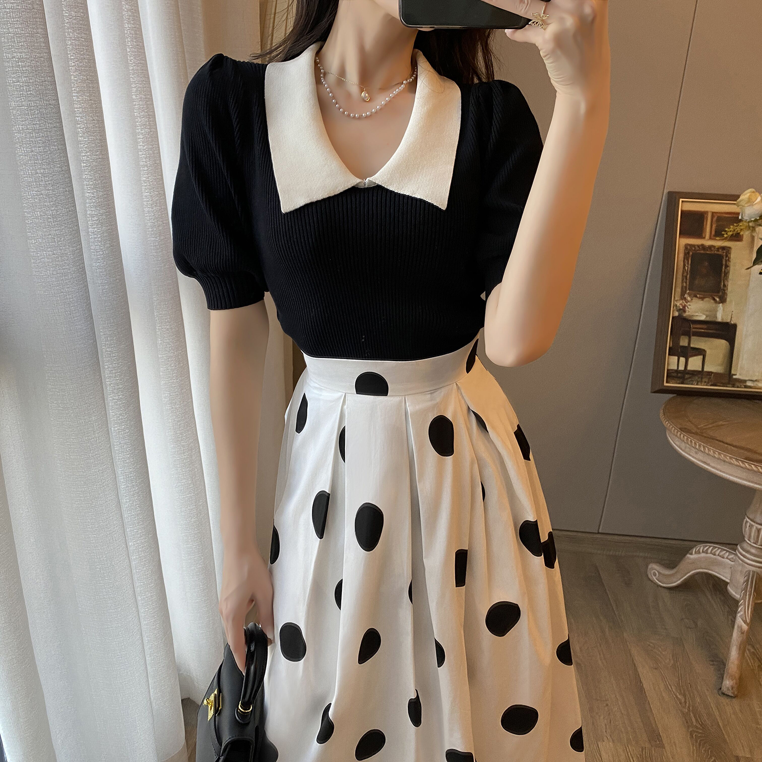 Size: S M L Fabric: Chiffon pattern: Polka Dot Style: Commuter: Retro collar: V collar waist: High waist Skirt Front: Pullover Color Classification: Black Top + Polka dot skirt (two-piece set) Sleeve Type: Regular Combination Form: two-piece skirt Type: A-line skirt Season: Summer Year Season: 2022 Summer Sleeve Length: Short sleeve skirt Length: Long skirt popular elements/craft: Printed style: Princess skirt profile: A