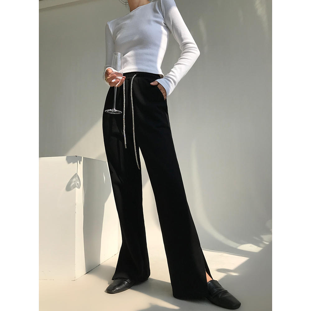 ACUP bright drill straps trousers split pants 2022 winter drawstring thin straight tube mopping wide-leg pants women