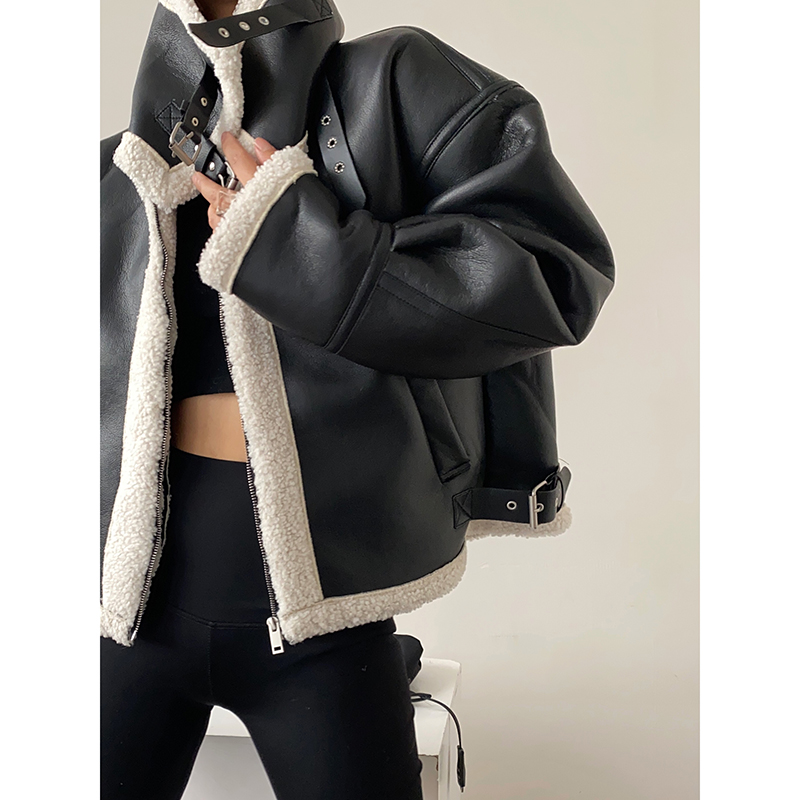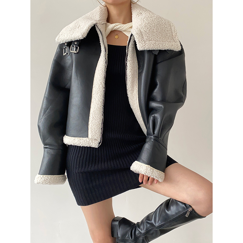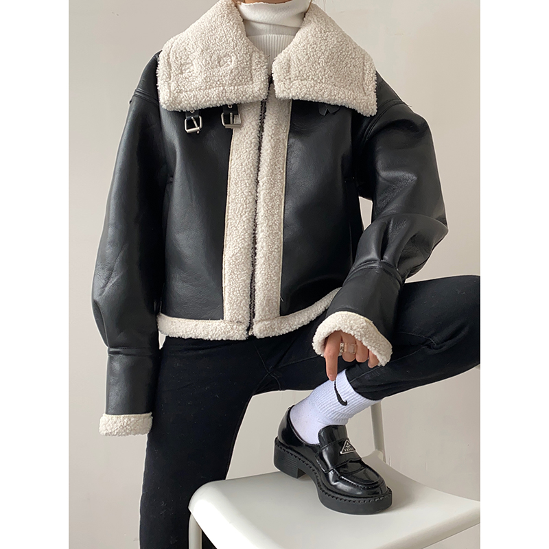 ACUP design sense niche motorcycle jacket 2022 winter punk lapel black and white contrast color lamb wool cotton short jacket