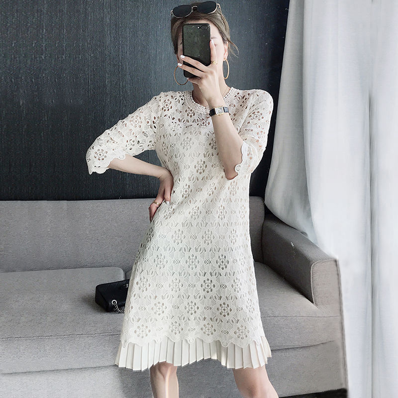 Size: M L XL 2XL 3XL Fabric: Chiffon pattern: Solid color Style: Commuter Commuter: Lady collar: Round collar waist: Loose waist skirt Front: pullover Color classification: off-white wine Type: Regular Combination Form: Single Item No. : 020210280 Skirt Type: Pleated skirt Applicable season: Summer year Season: spring 2022 Sleeve length: three-quarter sleeve skirt length: MIDI Skirt Popular elements/craft: embroidered hook cutout stitching lace style: Princess skirt silhouette: H