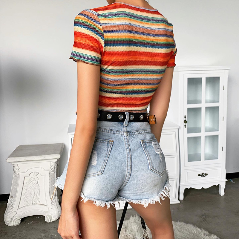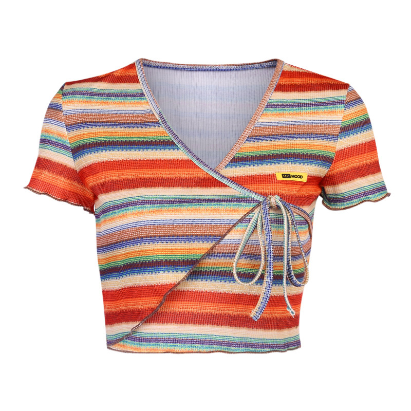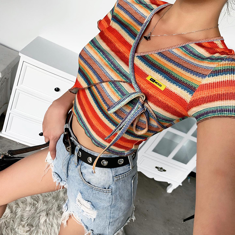 Europe and the United States V collar jacket design sense splicing minority short summer short sleeve strap stripe dew umbilical spice shoulder T-shirt female